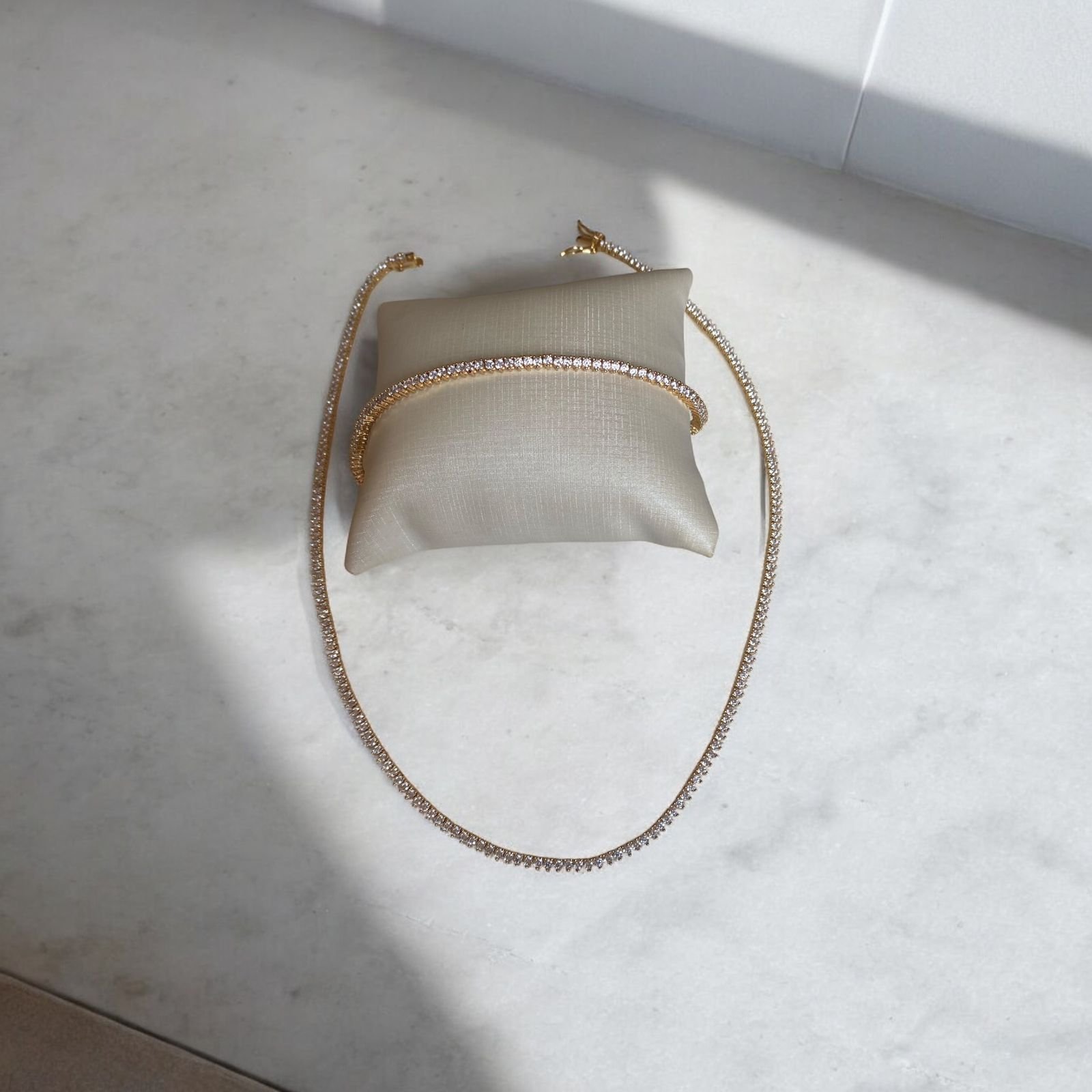 conjunto de colar e pulseira riviera no banho de ouro 18k.